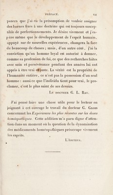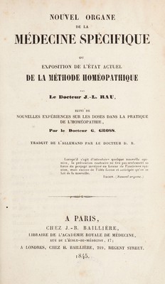 Nouvel organe de la médecine spécifique ou exposition de l'état actuel de la méthode homéopathique / par le docteur J.L. [sic] Rau, suivi de Nouvelles expériences sur les doses dans la pratique de l'homéopathie, par le docteur G. Gross. Traduit de l'allemand par le docteur D.R.