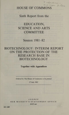 Biotechnology : interim report on the protection of the research base in biotechnology. Sixth report, Session 1981-82 / [Education, Science and Arts Committee].