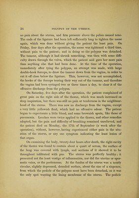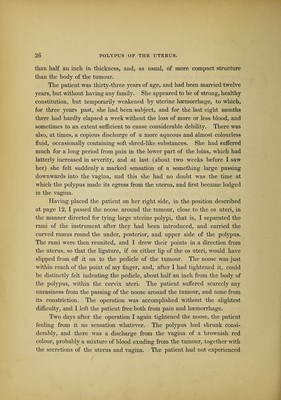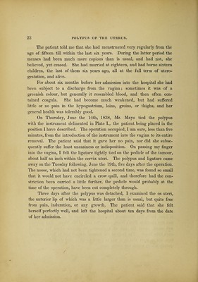 ![and a half avoirdupois. Its weight before the division of its pedicle was probably near three pounds. It measured, whilst lying on a horizontal plane eight inches and a half long, five broad, and above two thick, being somewhat flattened by its own weight. The tumour was of fibrous texture, but of very unequal firmness in different parts, being much more compact at its proximal than at its distal end, and on its surface were three or four slightly elevated portions, rather larger than a shilling. [For permission to publish the two following cases, and also for the opportunity of assisting in the operations, I am indebted to Mr. Mayo, Senior Surgeon of Middlesex Hospital.] CASE II. POLYPUS OF THE UTERUS. Mary Coyle, about 50 years of age, or rather more, was admitted, in June, 1838, into Middlesex Hospital, on account of an uterine polypus, and was placed in Bird’s Ward, under the care of Mr. Mayo. The polypus was small, about the size of a chesnut, its pedicle about the size of one’s little finger. The body of the tumour seemed just to have emerged from the os uteri, that is, it was in contact with it, and the pedicle conse¬ quently wholly within the cervix uteri.](https://iiif.wellcomecollection.org/image/b31898361_0025.jp2/full/800%2C/0/default.jpg)
