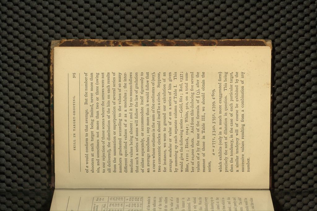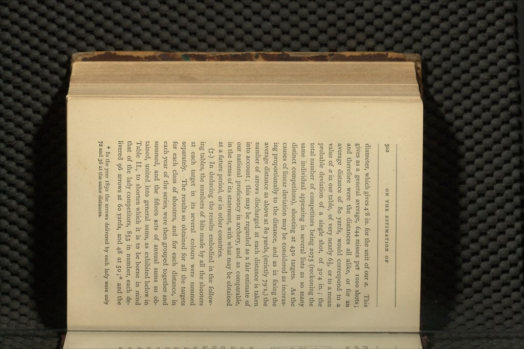 ![(10.) The same principles apply of course equally to rifle-shooting as to archery, provided the target aimed at be circular. If rectangular, and especially if an elon- gated rectangle, the same formulae will not apply; and the appropriate formulae would be necessarily much more complex and their results proportionably more difficult of calculation. This is a strong argument for the use of circular targets : for, though for the mere decision ot the order of merit in a distribution of prizes almost any impartial rule, rough and readily applicable, may suffice, the same cannot be said when the object is to obtain a true numerical measure of the national skill in the use of that great weapon : for which purpose it is highly desirable that the data afforded by our rifle prize meet- ings should be preserved, collected, and reduced syste- matically. NOTE. Demonstration of the formula in § (2.) and (3.) The probability of committing the specific error r (all errors pre- senting equal facility for their commission] is proportional to E (—£r-), the characteristic sign E being used to denote the expo- nential or anti-logarithmic function ; and k being some certain con- stant to be determined or eliminated. And in the case of aiming at the central point of a circular target, the degree of facility afforded for the commission of a lineal error r, no matter in what direction, is proportional to 2irr, the circumference of a circle of that radius, or, simply to r: so that the probability of planting a shot some- where on the circtimference of that circle is measured by r. E (—for), and therefore the probability of making a hit anywhere within its area is proportional iofrdr. E (—kr1) taken between the limits o and r. Representing certainty therefore by i ; this probability (which we have denoted by H in the foregoing pages) will be ex-](https://iiif.wellcomecollection.org/image/b21180404_0522.jp2/full/800%2C/0/default.jpg)