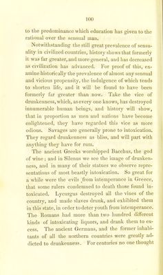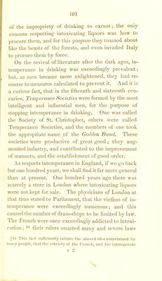 ![to repress the habit; destroying all the vines of the country—imprisonment—whipping — cutting off the ears of those found intoxicated, were successively re- sorted to, but with little effect towards arresting the evil. The age of Louis XIV, by creating a taste for intellectual and refined pleasure, did more to arrest intemperance in France, than all the laws of former rulers. 85 It is to the influence which a taste for intellectual pursuits exerts, that we must look to effect, and per- petuate a deliverance from sensuality. It was, in fact, increased intelligence, and a growing love for intellec- tual enjoyment, that enabled the people of this country to effect the reformation which they have produced, in the use of intoxicating drink. Temperance Societies, to be sure, did much good; but they were an effect themselves of the more general diffusion and love of knowledge, and could not have been sustained thirty years ago, nor by a people less intelligent. The cultivation of a taste for intellectual amuse- liabits of the British, are owing- to climate. The climate of France was the same before the age of Louis XIV, as it is at present, and yet, how temperate are the inhabitants now, compared with what they were at the period in question. Whenever the same refined tastes for elegant amusements prevail—whenever the British peo- ple become equally civilized, they will become as sober a3 the French, but not till then.—R.M.] 85 For the evidence of the truth of these statements respecting the history of intemperance, the reader is referred to the accounts of travellers among the Indians, and in Liberia, Africa, See. To an- cient historians, as Diodorous, Caesar, Tacitus, Pliny, Plutarch, and others. See also article Ivrognerie, Dictionnaire Des Sciences Me- diealcs, from which I have selected most of the foregoing facts.](https://iiif.wellcomecollection.org/image/b22028031_0120.jp2/full/800%2C/0/default.jpg)