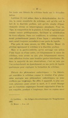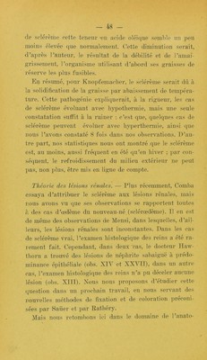 ![de selérème cette teneur en acide oléi(iue semble nn peu moins élevée (pie normalement. Cette diminution serait, d’après l’auteur, le résultat de la débilité et de l’amai- gTissement, l’organisme utilisant d’abord ses graisses de réserve les plus fusibles. Ru résumé, ])our Knopfemaclier, le selérème serait dû à la solidification de la graisse par abaissement de tempéra- ture. Cette i)atbogénie expliipierait, à la rigueur, les cas de selérème évoluant avec hypothermie, mais une seule constatation suft'it à la ruiner : c’est que, quelques cas de selérème peuvent évoluer avec liyperthermie, ainsi que nous l’avons constaté 8 fois dans nos observations. D’au- tre part, nos statistiques nous ont montré que le selérème est, au moins, aussi fréquent en été cpi’en hiver ; par con- séquent, le refroidissement du milieu extérieur ne peut pas, non plus, être mis en ligne de compte. Théorie des lésions rénales. — Plus récemment, Comba essaya d’attribuer le selérème aux lésions rénales, mais nous avons vu que ses observations se rapportent toutes à des cas d’œdème du nouveau-né (sclérœdème). 11 en est de même des observations de Mensi, dans lesquelles, d’ail- leurs, les lésions rénales sont inconstantes. Dans les cas de selérème vrai, l’examen histologique des reins a été ra- rement fait. Cependant, dans deux cas, le docteur Haw- tborn a trouvé des lésions de néphrite sabaiguè a prédo- minance épithéliale (obs. XIV et XX^’IT), dans un autre cas, l’examen histologique des reins n’a pu déceler aucune lésion (obs. XIII). Xous nous proposons d’étudier cette (piestion dans un prochain travail, en nous servant des nouvelles méthodes de fixation et de coloration préconi- sées par 8aüer et par Rathéry. Mais nous retombons ici dans le domaine de l’anato-](https://iiif.wellcomecollection.org/image/b22423965_0050.jp2/full/800%2C/0/default.jpg)