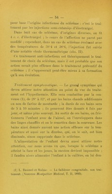 ![inoflifio ; cepeiKlant, dans un cas de sclérèine évoluant avec do d’ iement de eJioix du solérome, mais il est ])rol)able que son qu’à sou évolution. Traitement symptuntatique. — Le graii^ symptôme qui devra attirer notre attention au point de vue du traite- ment est 1’lqypotliermie. Etle sera combattue par la cou- Gu non de farine de moutarde ; la durée de ces bains sera de 5 à 10 minutes ; ils pourront être donnés 4 fois par jour, et même plus souvent. Au sortir de ces bains, on fric- tionnera l’enfant avec de l’alcool, on l’enveloppera dans des linges chautfés et on le remettra dans la couveuse. Les bains ainsi donnés auront une action efficace sur la tem- ])érature et aussi sur la diurèse, (|ui, on le sait, est bien diminuée, sinon supprimée dans le sclérème. L’alimentation de l’enfant devra aussi attirer notre attention, car nous avons vu que, lorsque le sclérème a atteint la face et les joues, la succion devient ini})Ossible ; il faudra alors alimenter l’enfant à la cuillère, en lui don- (1) L. Hainncl et Malzac. — La faiblesse congénitale, son trai- tement. {.\oiiveau Montpellier Médical, T. Il, 1893). action serait ])lus efficace dans le traitement préventif du sclérème ; il s’opposerait peut-être mieux à sa formation veuse (1), de 28° à 32°, et par les bains chauds additionnés](https://iiif.wellcomecollection.org/image/b22423965_0056.jp2/full/800%2C/0/default.jpg)