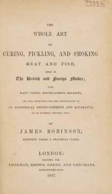 The whole art of curing, pickling, and smoking meat and fish, both in the British and foreign modes; with many useful miscellaneous receipts, and full directions for the construction of an economical drying-chimney and apparatus, on an entirely original plan / by James Robinson.