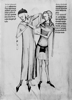 Credit: M0007588A: Manuscript illustration of two men from <i>Anothomia Philippi Septimi</i>, 1345. Source: Wellcome Collection.