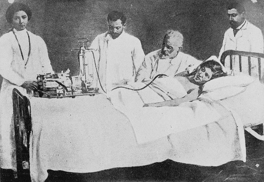Credit: M0016897: Portrait of Carlo Forlanini (1847-1918) / M0016898: Carlo Forlanini administering an artificial pneumothorax. Source: Wellcome Collection.