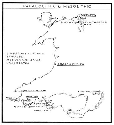 M0016519: Map showing limestone areas in Wales and their relation to Palaeolithic and Mesolithic sites