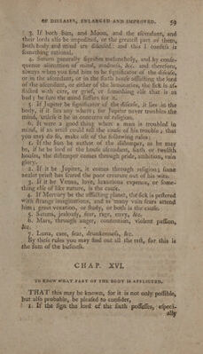 ![60 CULPEPER’s ASTROLOGICAL JUDGMENT : then, - 2. Confider what part of the body the fign he is in -go- verns, as Aries. governs the head, Taurus the néek and throat, &c*. and be fure that part is afflicted. © | 3. Confider what part of the body the afflicting planet rules, what fien, which are under that fign, and you need ‘not queftion but that is afflifted; for example, Venus, though fhe rule many parts of the bady, yet in Scorpio fhe rules only the privities+. rus affliéts ‘the body univerfally, but efpecially the left fide. | . 5. Saturn lord of the fixth in the laft degrees of Gemini, or in the'firft degree of Cancer, caufes pain in the left fide, as though an aw] were run into it. ; fhould rather think is‘melancholy. . - 9 Ifhebe in Virgo in the twelfth houfe, fignifies pain in the head: if he be in Scorpio oriental, and flow in mo- piffing blood. e : | ‘ 8. If Saturn be lord of the difeafe, and in Aquarius, the difeafe comes by travel. “ ; | & Here the lord of the fixth, or afflicting the fixth,. ~ the planet that afflits the fixth, or planet there. + Viz. That planet, being in the fign of Venus in Virgoy ~ yules the privities, &c.- Tg - Good rules alfo you ‘may obferve, and Ithink not amifs, though any planet fhould caft out an afpect to the fixth to fee what-parts the afpeting planet governs in the fign, as well as though he were daily in that fign, and fo by afpect affli@ts that part he governs. © A 3 iy the part the afpefting: planetegoverns .in, that fign he af- ‘pects : as if any planets afpedt the aged, fee whether the platieviafpeGinig doverns firftin that figh, fo that-part-is af- fligted according to’ the nature of the. planet. affliGting. 4 tule what fign the pidnet afllicting is in, 4](https://iiif.wellcomecollection.org/image/b22040675_0001_0804.jp2/full/800%2C/0/default.jpg)