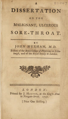 Credit: A dissertation on the malignant, ulcerous sore-throat / By John Huxham. Source: Wellcome Collection.