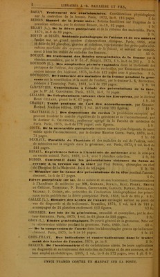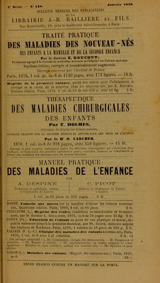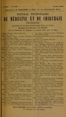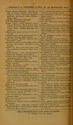 ![I , Librairie J.-B. BAILLIERE et FILS, 19, rue Hautefeuille, Paris JACCOUD. Agonie, Albuminurie, Amyloïde, An- gine de poitrine, Apoplexie, Bile, Bronzée (maladie), Diabète, Électricité, Encéphale, Endocarde, Endocardite, Goutte, Méninges, Moelle épinière. .Îàcquemet. Emphysème traumatique. Javal. Emmétropie, Lunettes. Jeannel. Copahu, Cubèbe, Dépuratif, Embau- mement. Émollients, Éthers, Extraits, Falsi- fications, Fécule, Ferment, Fumigation, Gelée, Gomme, Huiles, Liniment, Macération, On- guent, etc. Koeberlé. Aine, Bourses séreuses, Ovaires, Ova riotomie. JLabadie-Lagrave. Goutte, Hydrophobie, Leuco- cythémie, Méninges, Moelle épinière. Labat. Marienbad, Mont-Dor, Manheim, Néris, Niederbronn, Orezza. Lannelongue. Cornée, Gencives, Hématocèle du scrotum, Hémorrhoïdes, Lacrymales (voies) Mamelles. Laugier (St.). Abcès, Anus contre nature, Brû- lure, Commotion, Contusion, Cuisse, Encé- phale. Laugier (Maurice). Fesse, Hermaphrodisme, Hyoïde (os), Hypopyon, Lèvres, Naevus. ■Le Dentu, Caves (veines), Effort, Face, Hernies, Lymphatique (système), Main, Ongle. Lépine (R.). Diphthérie, Inanition. Jaebreich. Accommodation, Amaurose, Astigma- tisme, Cataracte. Longuet. Lymphatique (système) [avec Le Dentu], Os [avec Gosselin]. Lorain (P.). Accouchement (médecine légale), Age, Allaitement, Anémie, Chlorose, Choléra, DiphLhérie, Endémie, Épidémie. Lcton (de Reims). Aorte, Auscultation, Biliaires (voies), Catarrhe, Circulation, Cœur(anat. phy- siol.), Congestions, Dérivatifs, Dérivations, Dyspepsie, Entozoaires (pathologie), Estomac, Goitre, Hématémèse, Indigestion, Intestin, Œsophage. , Lunier. Crâne, Crétinisme, Folie. Marchand (L.). Baumes, Belladone, Café, Cham- pignons, etc. Martineau. Aphthes.Cénhalalgie, Colique, Coma, Constipation, Crachats, Dermalgie, Émacia- tion, Épistaxis, Obésité, etc. Michea. Démonomanie, Dynamomètre, Dyna- moscopie, Extase Motet. Cauchemar, Hallucinations, Illusions. Nélaton (A.). Arteres. Ollivier (Aug). Aphonie, Calculs, Cantharides, Caoutchouc. Oré. Aliment, Bains, Bégaiement, Bronches, Déglutition, Moelle épinière. Nasales (fosses), 'Nerfs (patli. chir.), Olfaction. Pain (A.). Asiles (asiles d’aliénés, asiles de con- valescents, salles d’asile), Douche. Panas. Articulations, Cicatrices, Cicatrisation Épaule, Genou. Poinsot (de Bordeaux). Nasales (fosses) [avec Oré], Olfaction. Poncet (F.), Jambe, Lit, Nyctalopie, Ophthal- moscope. • Ranvier. Capillaires (vaisseaux), Épithélium. ■'* Raynaud (Maurice). Albinisme, Artères (maladies) 1 Azygos (veine), Cachexies, Caves (veines)ï Cœur (anomalies, pathologie), Diathèse, Érysi- - pèle [avec Gosselin], Gangrène, Hématidrose,|J Maladie. Rey (H.). Géographie médicale, Mal de mer.fj Marais, Nostalgie. Richet. Anévrysmes, Carotides, Clavicule. Ricord. Antiaphrodisiaques, Aphrodisiaques. 3 Rigal(A.). Exutoires, Habitus extérieur. Langue, ', Mensuration, Oreillon. Rochard (J.). Acclimatement, Air marin, liéri- ? - béri, Climat, Dengue, Drainage chirurgical. J| Roussin(Z.). Arsenic, Catalyse, Champignons, Cui- - vre, Désinfectants, Digitale, Empoisonnement. . Saint-Germain (L.-A.). Amygdales, Charpie, Cir- ■ concision, Crâne, Électricité, Encéphalocèle,!, Éponge, Hydrocèle, Ombilic. Sarazin (Ch.). Ambulances, Appareil, Atrophie, Bandages, Caoutchouc, Caustique, Cautère,-,. Cautérisation, Compression, Compresseur, Cou, Dent, Dentition, Hôpital, Inguinale (région), Injection, Irrigation, Ligature, Oreille. SÉE (Germain), Asthme. Simon (Jules). Atrophie musculaire progressive, Chorée, Contracture, Croup, Foie, Ictère, Muguet. Siredey. Dysménorrhée, Emménagogue, Impuis- • sauce, Menstruation. Stoltz. Accouchement, Césarienne (opération), Couches, Dystocie, Grossesse, Leucorrhée. * Strauss (I.). Hydropisie, Lait, Muqueuses (mem- branes). Tardieu (Amb.). Air, Arsenic, Asphyxie, Avorte- - ment, Blessures, Digitale, Eaux minérales, Empoisonnement, Exhumation, Fœtus, Folie, Hermaphrodisme, Identité, Infanticide, Inhu- mation, Mort, Morve et farcin. Tarnier (S.). Céphalématome, Cordon ombilical. Embryotomie, Forceps. Trousseau. Ataxie locomotrice progressive. Vaillant (L.). Entozoaires, Éponge, Limaçon, Musc. Valette. Coxalgie, Cystite, Cystocèle, Ecrase- ment linéaire, Fractures, Hanche, Luxation. Veiuon. Eaux minérales, etc. Voisin (Aug. Amnésie, Aphasie. Curare, ÉpiloP* sic, Hérédité. Envoi FRANCO par la poste contre un mandat.](https://iiif.wellcomecollection.org/image/b28142470_0834.jp2/full/800%2C/0/default.jpg)