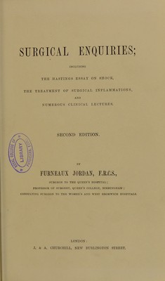 Surgical enquiries : including the Hastings essay on shock, the treatment of surgical inflammations, and numerous clinical lectures / by Furneaux Jordan.