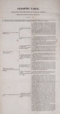 ![SYNOPTIC TABLE, CONTAINING THE PRINCIPLES OF NATURAL LABOURS, AND THOSE UEQUIRING MANUAL ASSISTANCE. To uQdcrstQDd the principles contained in these two tables, it is oecessai'y to remember the dimensions of the pelvis, and of the head of fœtus. Moreover the mechanism of natural labour should be well known, of which the others should only be an imitation. Dimensions of the female pelvis. Dimensions the female pelvis and foetal lieatl. Dimensions of tbe fœtal bead. First, occiput towards the left acetabulum. Second, occiput towards the right acetabulum. Head presentations. Four positions. J Third, tbe occiput towards tbe right sacrO'iliac junction. Fourth, tbe occiput to> wards tbe left sacro-iliac junction. Breech presentations. Four positions of the feet, knees and thighs. First, the heel or tibia to the left acetabulum. Second, to the right. Third, to tbe right sa- cro'iliac. Fourth, the left sacro- iliac junction. f Presentation of the head Labours .ciuiring manual assist- I j tremities of the feet, Jmees [ or nates. The pelvis in tbe superior and inferior strait, and the hol- low comprised between them. Axis of the superior strait: a line drawn from the umbilicus, to tbe inferior extremity of the sacrum. Axis of tbe inferior strait, a line passing, from the sacro-vertebral angle to the centre of the vulva. Length of the four diameters of tbe superior strait in the living subject: aDtero.>posterior or sacro-pubic four inches: transverse four; the oblique from one acetabulum to the opposite sacro-iliac sym- physis four and a half. Length of the four diameters of the in- ferior strait, each four inches; the anteru-posterior may acquire half or three-fourths of an inch, by the motion of the coccyx back- wards. Extent of the cavity of the pelvis; from the symphysis pubis to the hollow of the sacrum five inches ; this is the greatest . diameter. f We distinguish five diameters; occipito mental five inches and i even five and a quarter; occipito-frontal four and one'fourth*. Irans- versclyfrom one parietal protuberance to tbe other three and one half: perpendicular diameter from tbe vertex to the base of tbe cranium three or three and a half. Mechanism. Flexion of the chin on the breast. The head clears the superior strait. Movement of rotation prociucedby the inclined planes of the pelvis; tbe occipital protuberance is carried behind the symphisis pubis, the face toward the hollow of the sacrum. The head arrived at the interior strait; clears it; the occiput ] is first disengaged as in all head presentations; then the face by jvassiDg successively over the whole concavity of the sacruni; the shoulders enter the superior strait diagonally; perl'orrn a movement of rotation ; the one which is to tbe back part first escapes from the inferior strait. Tbe same mecharvism for the nates. The same mechanism, except that after the rotatory move- ment, the face comes behind the symphysis pubis and the vertex into (he concavity of the sacrum; the occiput is first disen- gaged and tbe face follows. ^ When the chin first presents and is in front, (be delivery may j take place; then the face is first disengaged; this position isex- ilremely rare. The bead is thrown backwards. Sitould tbe chin present and the bead be thrown backwards, nat irai delivery is impossible. f Mechanism. The thighs enter the superior streit diagonally; movement of rotation; one arrives behind the symphisis pubis; and the other in the concavity of the sacrum: the posterior one is first delivered. The same mechanism ibr the shoulders. • The chin is bent on the breast to clear the superior strait. Movement of rotation; the occiput arrives behind the symphy- sis pubis, and the face in tlie cavity of the sacrum. The face is first delivered from the inferior strait, as ia all cases of breech presentation, and the occiput last. C The same mechanism except that after tbe movement of ro- } tation the face is carried behind the pubis and the occiput to- ( wards the sacrum; the face is also first delivered. [ Two Indications First, When the labour is without accident, and the head is near the superior strait, but badly situated, to place it in tbe natural situation. To do this we introduce tbe hand opposite the side of the pubis, to where tlie head is placed; press the fingers of this band on the vertex if possible; bring it into the superior strait, diagonally; then abandon the rest to na- ture: the lever may be advantageousiysubslltutcdfor the hand. Second, When there is syncope, convulsions, dangerous he- 1 morrhage, want of uterine ar.tion; lay hold of (he feot and I turn the childl Whatever is tbe position, introduce tbe hand j which corresponds to tbe side of tbe child which is backwards; 1 the right, if it be the right side; the left, if it be the left; pass the hand over tbe lateral parts of the trunk, which arc found back- wards; lay bold of the feet together, if possible, orsejiarately and bring them out of the vulva. Apply at the same lime (he other hand over the uterus to incline its fundus toward (be opposite side. When we cannot get but one foot at a time, disengage it. in the direction of adduction, pass a fillet round it, to secure it and search again, with (he same hand, for the other foot: change the (bird and fourth positions, to lljp fii'st and third, if possible, by giving the trunk in proportion as it is disengaged, slight movements of rotation from without inivards; disengage (he arm in the direction of adduction by commencing with the one which is behind, first depressing the shoulder; then by passing the hand over the different parts of the face and chest, give the head its movement of llexion, by applying the ends of the fin- gers uf one hand upon tbe occiput which is raised, and (be other upon the sides of the nose, to depress the head; give it the movement of rotation, by placing tbe fingers of one hand near one of tbe mastoid processes, and the other upon the opposite side of the chin; support the perioeum