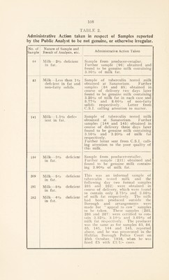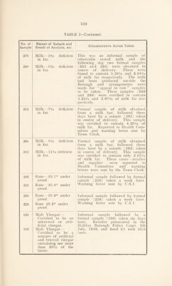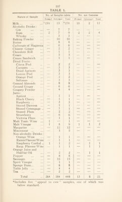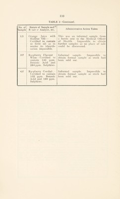 ![TABLE 4. Articles of Food examined for Preservative in accordance with the Public Health (Preservatives, etc., in Food) Regulations 1925/6/7. Food No. of Samples examin’d Nature of Preservative Amount Allowed Found Milk ... 269 Nil Nil 1 Nil Butter ... 8 Nil Nil Nil Chinese Ginger 2 Nil Nil Nil Chocolate Roll 1 Nil Nil Nil Cream ... 5 Nil Nil Nil Dried Fruits : Citron Peel . 2 Sulphur 100 ppm. 1-Nil Dioxide 1-70 ppm. Currants 3 » » 750 ppm. Nil Dried Apricots 3 » 9 2000 ppm. 2-819 ppm. 1-1114 ppm Lemon Peel 3 5 t 100 ppm. Nil Orange Peel . 2 » f 100 ppm. Nil Sultanas 3 i 9 750 ppm. 1-251 ppm. 1-262 ppm. Jams : 1-291 ppm. Apricot 1 » » 40 ppm. Nil Black Cherry ] » 9 40 ppm. Nil Raspberry 3 9 9 40 ppm. Nil St. Damson ... 1 9 9 40 ppm. Nil St. Greengage 1 » > 40 ppm. Nil Stoned Plum . 2 » 1 40 ppm. Nil Strawberry ... 6 » » 40 ppm. Nil Victoria Plum 1 » 9 40 ppm. Nil Malt Tonic Wine 1 9 9 450 ppm. Nil Margarine 12 Nil Nil Nil Mincemeat 5 Sulphur 350 ppm. Nil Dioxide Non-alcoholic Drinks : Orange Wine . 1 f Sulphur 350 ppm. 113 ppm. j D oxide Nil J or | Benzoic 600 ppm. l Acid Raisin Flavour Wine 1 f Sulphur 350 ppm. Nil | Dioxide 130 ppm. or 600 ppm. Benzoic Acid Remarks | Satisfactory j- Satisfactory | Satisfactory j Satisfactory 1 Satisfactory](https://iiif.wellcomecollection.org/image/b29406353_0114.jp2/full/800%2C/0/default.jpg)