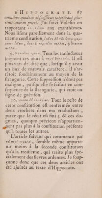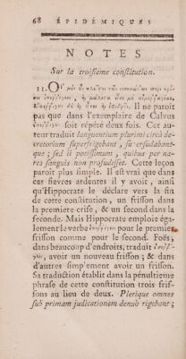 Épidémiques d'Hippocrate traduites du grec; avec des réflexions sur les constitutions épidémiques: suivies des quarante-deux histoires rapportées par cet ancien médecin, et du commentaire de Galien sur ces histoires. On y a joint un mémoire sur la mortalité des moutons en Boulonnois, dans les années 1761 et 1762, et une lettre sur la mortalité des chiens, dans l'année 1763, dans laquelle sont dévelopées les vûes d'Hippocrate sur les constitutions. Par M. Desmars / [Hippocrates].