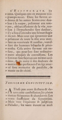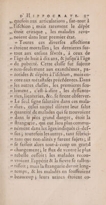 Épidémiques d'Hippocrate traduites du grec; avec des réflexions sur les constitutions épidémiques: suivies des quarante-deux histoires rapportées par cet ancien médecin, et du commentaire de Galien sur ces histoires. On y a joint un mémoire sur la mortalité des moutons en Boulonnois, dans les années 1761 et 1762, et une lettre sur la mortalité des chiens, dans l'année 1763, dans laquelle sont dévelopées les vûes d'Hippocrate sur les constitutions. Par M. Desmars / [Hippocrates].