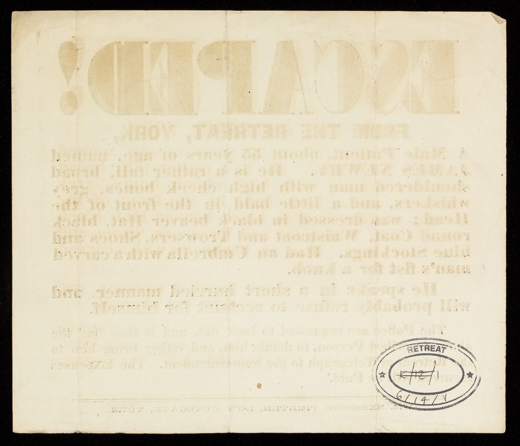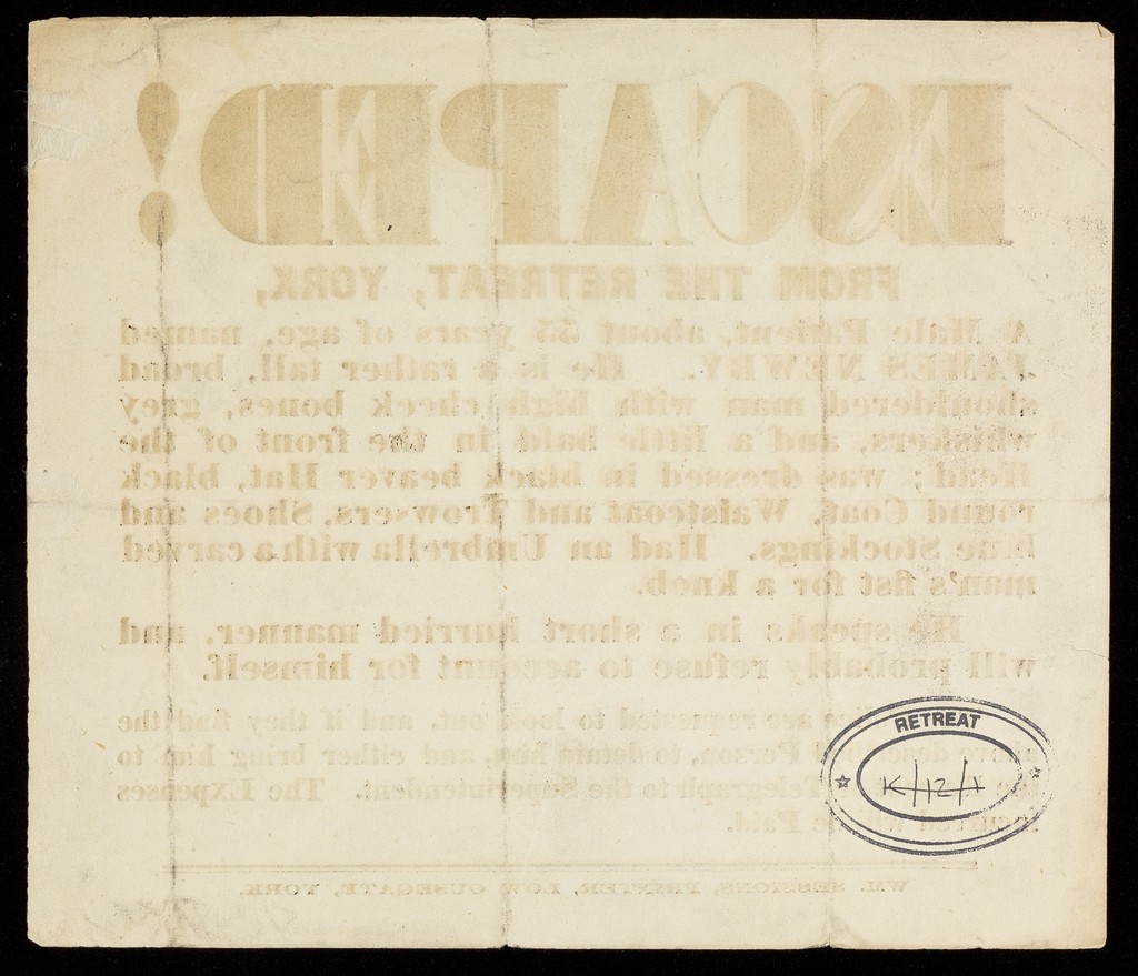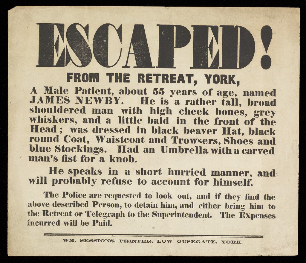 Credit: Printed Notice of Escaped Patient, James Newby. Source: Wellcome Collection.