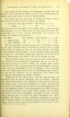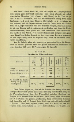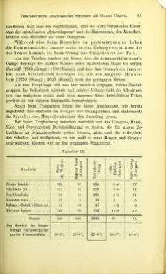 ![rundlichen Kopf ohne den Sagittalkamm, ohne die stark vortretenden Bhefer, ohne die entstellenden „Scheuklappen“ und die Halswamme, den Menschen- kindern weit ähnlicher als unser Orangriese. Während also beim Menschen iin postembryonalen Leben die Beinmusculatur immer mehr in das Uebergewicht über die des Armes kommt, ist beim Orang das Umgekehrte der Fall. Aus den Tabellen ersehen wir ferner, dass die Armmusculatur unseres Orangs diejenige des starken Mannes selbst in absolutem Maass hei weitem übertrifft [2385 (Orang : 1780 (Mann)], und dass das Orangbein immer- hin noch beträchtlich kräftiger ist, als ein mageres Mannes- bein [2250 (Orang) : 2025 (Mann)], trotz der geringeren Grösse. Als eine Hauptfrage tritt uns hier natürlich entgegen, welche Muskel- gruppen das bedeutende absolute und relative Uebergewicht des Affenarmes und das wenigstens relativ auch beim mageren Mann beträchtliche Ueber- gewicht an der unteren Extremität hervorbringen. Schon beim Praepariren lehrte die blosse Anschauung, wie bereits angedeutet, dass einerseits die Beuger des Orangarmes und andererseits die Strecker des Menschenbeines den Ausschlag geben. Bei dieser Vergleichung brauchen natürlich nur das Ellbogen-, Hand-, Knie- und Sprunggelenk Berücksichtigung zu finden, die für unsere Be- trachtung als Scharniergelenke gelten können, nicht auch die Arthrodien, das Schulter- und Hüftgelenk, wo wir nicht so reine Beuger und Strecker unterscheiden können, wie an den genannten Scharnieren. Tabelle III. Muskeln Mann (E. Weberl Magerer Mann (Langer) Erwachsener Orang 4 jähr. Mädchen (Lan ger) 4 jähr. Orang (Langer) Biceps brachii 125 37 125 6-4 17 Brachialis int 117 44 200 9-1 21 Brachioradialis .... 58 19 196 2*4 21 Pronator teres 37 9 39 2 5 Palmar.+Eadial.+Ülnar. int. 51 19 85 4-5 9 Plexores digitor 145 55 276 14-3 42 Suname . . 533 183 1021 39 115 Das Gewicht der Beuger beträgt vom Gewicht der ganzen Armmusculatur . 30-0«/o 27-O»/« 42-8 \ 29-0% 45-8«/„](https://iiif.wellcomecollection.org/image/b22473300_0063.jp2/full/800%2C/0/default.jpg)