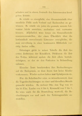 ![;irl)eitcn und iu einem Journale den Interessenten kund geben könnte. So würde es er]n()glicht, eine Gesanitstatistik über sämtliche Fälle nacb Verlauf und Endresultat zu ge- winnen. So würde ein jeder die gesamte neueste Lit- teratur leiclit erreiclien, nacliselien und verwerten können. Alljäln-licli wäre ferner ein Generalbericht zusammenzustellen, der einen Überblick über die lamnenbaft anwachsende Litteratur ermöglichte, die man zuverlässig in einer bestimmten Bibliothek vor- rätig finden sollte. Griesinger giebt in seiner Tabelle die Zeit des ersten Auftretens der Krankheit, Dickinson die Zeit des Todes, während andere die Zeit allein berück- sichtigten, zu der sie den Patienten in Behandlung nahmen. Einzelne Ärzte beschränken ihre Beobachtungen auf die Badepraxis, so dass ihnen fast keine Kinder vorkommen. Wieder andere haben nur Spitalpraxis etc. Für die Schriftsteller wäre es wünschenswert, dass die Tagesbeobachtungen zu einer und derselben Stimde gemacht wüi'den. So rechnet Otto den Tag von 10 bis 10 Ulu-, Laube von 6 bis 6, Krausold von 7 bis 7. Es wäre auch für die Beurteilung wertvoll, die Be- obachtungen vor und nach der Nahrungszufuhr an- zustellen.](https://iiif.wellcomecollection.org/image/b21719834_0198.jp2/full/800%2C/0/default.jpg)