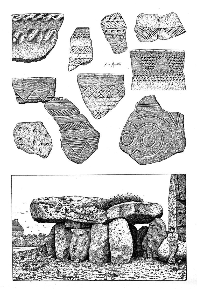 M0015195: Illustration of pottery ornamentation and the dolmen of Crucuno, Plouharnel, France. In copyright. Source: Wellcome Collection.