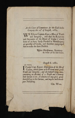 An historical relation of the island Ceylon, in the East-Indies: together with an account of the detaining in captivity the author and divers other Englishmen now living there, and of the author's miraculous escape / By Robert Knox...; ill. with figures and a map of the island [With preface by Robert Hooke].