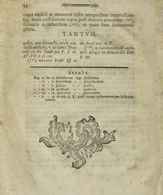 ![ciens capitis et manuum iuftis temporibus intumefcem tia, noua puftularum copia poft alteram erumpens (U7), faliuatio in infantibus (^38); et quae funt huiusmodi plura. T A N T V M. pofita, cum’fubluii(n:a cniuls me- the Small pox eh.V, dendi methodo, v. in lobb’s Trea» Q ^g. cleghorn’s oif. onth tife on ths Small pox P, 1. ch, epid. dijeajes in Mimrea IIL Edit iV - VJL p. Sf -120, p. (^^7^ HiLLARY PraSl, EJJ. on ERRATA. Pag, 15 lin. 7. (iiuiofionem lege diuifionem , - - 16 - 6- fuccentibus - - fiiccedendbiis “ “ 18 ' 7« tvd'^es‘ - - kv?]B'8S‘ - -23 - 28 perfluere • - profluere • • 24 - 32. pericufior - - pericidofior - - 32 - 4. ab init. 6. X. poft sQZQin inflammatoriam inferatur haknt.](https://iiif.wellcomecollection.org/image/b30348092_0056.jp2/full/800%2C/0/default.jpg)