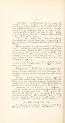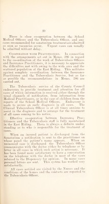 ![TJiere is close c()-oj)eratioii heiween the Scliool Medical Ohicers and the Tuberculosis Officer, and any cases recommended for sauaiorium treaimeutareadmitted as soon as vacancies occur. Uro’ent cases can usually he admitted witiioiit delay. c Co-OI’ERATION WITH Pr \CTIT10NKRS. Ill COUllCCiioU with the arraiiyemeuts set out in ]\Iemo. 280 in ren:ard to the co-ordiiiatiou of the work of Tulx'rculosis Officers and Insurance Practitioners, it is necessary to appreciate the difficulties met with owin«‘ to tlie wide area and tlie scattered poj)ulation of the East Pidin^'. This militates against complete co-ordination hetween the Insni'anc.e IT’actitioner and the Tnhercnlosis Service, hut as far • as possible the recommendations in ^lemo. 28() are carried out. The Tul)erculosis service of the County (a)nnc.il endeavours to provide treatment and attention for all cases of Avhicii information is received (u’ther throngli the usual channels of notification, from infoiination from Medical Practitioners, or in tlie case of children from the reports of the School Medical Officers. Endeavoui* is made to secure an early diagnosis in all cases. The Clinical Tuberculosis Officer is at all times anxious to assist in the diagnosis and to arrange for Ihe treatment of all cases coming to his notice. Effective co-operation between Insurance Prac- titioners and thei Tuberculosis staff is fully maintained in the East Eiding. There is always a definite under- standing as to who is responsible for the treatment of cases. When an insured ])atient is discharged from the Sanatorium a notification is sent to the practitioner on whose panel the patient’s name a])])ears. M hen an uninsured case is discharged the Tuberculosis Office]* comninnicates with the doctor eitliei* by telephone or by letter in all cases in which such action is necessary. It has been found more satisfactory to have a conversation on the telephone with the doctor in Jiiost of the f-ases referred to the Dispensary foi' opinion. In many cases personal letters are sent. This system has worked very satisfactorily. All cases notified are visited by ihe Nurses and the conditions of the honies and the contacts are repoi'tod io the Tuberculosis Officer.](https://iiif.wellcomecollection.org/image/b29185348_0063.jp2/full/800%2C/0/default.jpg)