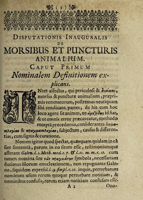 Credit: Disputatio inauguralis medica de morsibus et puncturis animalium ... / [Johann Kaspar Witzel]. Source: Wellcome Collection.