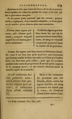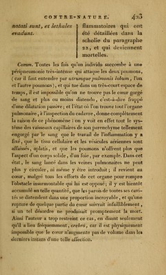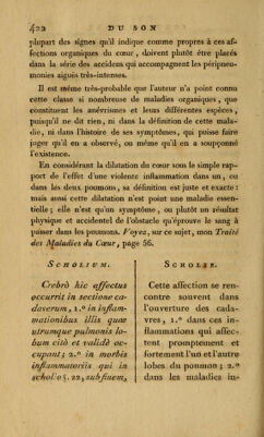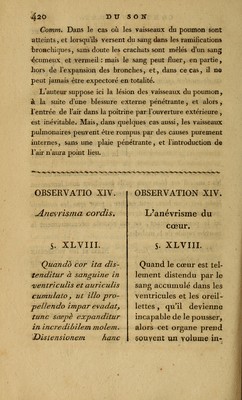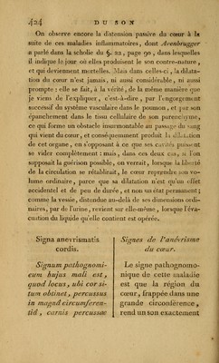 ![4^4 du soïî On observe encore la distension passive du cœur à la suite de ces maladies inflammatoires, dont Avenbrugger a parlé dans la scholie du §. 22, page 90 , dans lesquelles il indique le jour où elles produisent le son contre-nature , et qui deviennent mortelles. Mais dans celles-ci, !a dilata- tion du cœur n'est jamais , ni aussi considérable, ni aussi prompte : elle se fait, à la vérité, de la même manière que ]*e viens de l'expliquer, c'est-à-dire , par l'engorgement successif du système vasculaire dans le poumon , et par son épanchement dans le tissu cellulaire de son parenchyme, ce qui forme un obstacle insurmontable au passage du sang qui vient du cœur, et conséqueinment produit la dilatation de cet organe, en s'opposant à ce que ses cavités puissent se vider complètement : mais, dans ces deux cas. si l'on supposait la guérison possible, on verrait, lorsque la liberté de la circulation se rétablirait, le cœur reprendre son vo- lume ordinaire, parce que sa dilatation n'est qu'un effet accidentel et de peu de durée , et non un état permanent ; comme la vessie, distendue au-delà de ses dimensions 01 di^ naires, par de l'urine, revient sur elle-même , lorsque l'éva- cuation du liquide qu'elle contient est opérée. Signa anevrismatis cordis. S/gnum pathogno mi- en m hujus mali est y quod locus y ubi cor si- tum obtinety percussus in maond circumfercn- tid _, carras perçussac Signes de l'anévrisme d u cœur. Le signe pathognomo- nique de cette maladie est que la région du cœur, frappée dans une grande circonférence, rend un son exactement](https://iiif.wellcomecollection.org/image/b21039252_0456.jp2/full/800%2C/0/default.jpg)