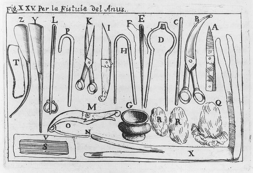 Credit: M0017579: Illustration of instruments used in the treatment of anal fistulas, 1723. Source: Wellcome Collection.