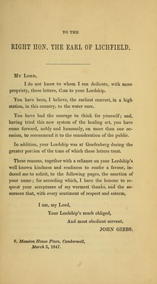 Letters from Graefenberg, in the years 1843, 1844, 1845, & 1846 : with the report, and extracts from the correspondence, of the Enniscorthy Hydropathic Society / by John Gibbs.