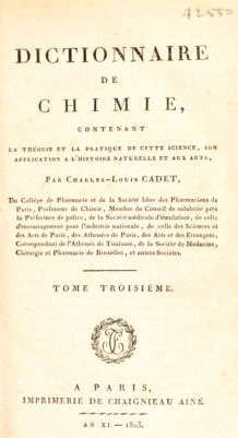 Credit: Dictionnaire de chimie. Contenant la théorie et la pratique de cette science, son application à l'histoire naturelle et aux arts / par Charles-Louis Cadet. Source: Wellcome Collection.