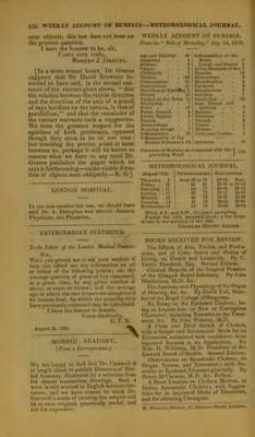 ![near objects, this law docs not bear on the present question. I have the honour to be, sir, Yours very truly, Robert J. Graves. [In a more recent letter, I)r. Graves suggests that Sir David Brewster in- tended to have said, in the second sen- tence of the extract given above, “ that the relation between the visible direction and the direction of the axis of a pencil of rays incident on the cornea, is that of parallelism,” and that the remainder of the extract warrants such a suggestion. We have the greatest respect for the opinions of both gentlemen, opposed though they seem to be to our own: but touching the precise point at issue between us, perhaps it will be better to reserve what we have to say until Dr. Graves publishes the paper which be says is forthcoming—on the visible direc- tion of objects seen obliquely.—E. G.] LONDON HOSPITAL. Tn our last number but one, we should bare said Dr. A. Frampton was elected Assistant Physician, not Physician. VETERINARIAN STATISTICS. To the Editor of the London Medical Gatette. Sin, Wm you permit me to ask your readers if they can afford me any information on all or either of the following points; iit. the average quantity of grass or hay consumed, in a given time, by any given number o't sheep, or oxen, or horses ; and the average age at which the two former are slaughtered for human food, by which the quantity they have previously consumed may be calculated. I have the honour to remain, Yours obediently, G. T. B. August 13, 1832. MORBID ANATOMY. (From a Correspondent.) We are happy to find that Dr. Carswell is at length about to publish Elements of .Mor- bid Anatomy, illustrated by a selection from his almost numberless drawings. Such a work is still wanted in English medical lite- rature, and we have reason to think Dr. Carswell’s mode of treating the subject will be at once original, practically useful, and not too expensive. WEEKLY ACCOUNT OF BURIALS, From the “ Billsof Mortality,'’ Aug. 14,18J2. Age and Debility . 38 Apoplexy . . 6 Asthma . . 8 Cancer . . 2 Childbirth . . 7 Cholera . .103 Consumption . 65 Convulsions . 41 Dentition orTeetHfog 5 Dropsy . . 1(1 Dropsy on the Brain 14 Erysipelas . . 1 Fever . . .10 Fever, Scarlet . 4 Fever, Typhus . 8 Fistula . . 1 Haemorrhage . I Hooping Cough . 7 Inflammation . 29 Inflammation of the Bowels A Stomach 24 Inflammation of the Brain . . 2 Lungs and Pleura 3 Livcr.Diseases of the 7 Measles . . 12 Miscarriage . 2 Mortification . 4 Paralysis . . 4 Rheumatism . 2 Scrofula . . 1 Small-Pox . . 22 Sure Throat and Quinsey Spasms . . 4 Stricture . . 1 Thrush . . 3 Tumor . . . 1 Worms ... 1 Unknown Causes. 3 Stillborn Decrease of Burials, as compared with the ) preceding Week } 12 179 METEOROLOGICAL JOURNAL, August 1832. Thursday . 9 Friday. . . 10 Saturday . 11 Sunday . . 12 Monday. . 13 Tuesday . 14 Wednesday 15 Thermometer. from 49 to 79 63 81 54 77 50 72 45 76 47 76 63 73 Barometer. 30 03 Stat. 30 05 to 80*13 30*15 30*19 30 17 30*02 29*95 29 89 29.84 29*85 29*86 29*84 Wind, S.E. and 9.W. the latter prevailing. Except the 13th, generally ei**ar> a few drops of rain in the morning of the 13th. Charles Henry Adams. BOOKS RECEIVED FOR REVIEW. The Effects of Arts, Trudes, and Profes- sions, and of Civic States and Habits of Living, on Health and Longevity. By C. Turner fbackrab, Esq. Second Edition. Clinical Reports of the Surgical Practice of the Glasgow Royal Infirmary. By John Macfurlane, M.D. Ac. The Anatomy and Physiology of the Organ of Hearing, &c. &c. By David Tod, Mem- ber of the Royal College of Surgeons. An Essay on the Epidemic Cholera; be- ing an Inquiry into its New or Contagious Character; including Remarks on the Treat- ment, &c. By John Webster, M.D. A Plain and Brief Sketch of Cholera, with a Simple and Economical Mode for its Tieatiuent, submitted with confidence, from repeated Success in its Application. By Wm. H. Williams, M.D. President of tho Ipswich Board of Health. Second Edition. Observations on Spasmodic Cholera, its Origin, Nature, and Treatment; with Re- marks on Epidemic Diseases generally. By Henry M'Cormac, M.D. &c. Belfast. A Short Treatise on Cholera Morbus, or Indian Spasmodic Cholera; with Sugges- tions for an improved Mode of 'treatment, and for obviating Contagion. W. Wilson, Printer, 57, Skinner-Street, London.](https://iiif.wellcomecollection.org/image/b21969516_0026.jp2/full/800%2C/0/default.jpg)