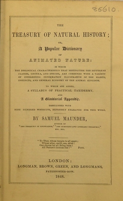 A treasury of natural history; or, a popular dictionary of animated nature ... To which are added, a syllabus of practical taxidermy, etc / [Samuel Maunder].