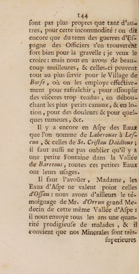 Lettres contenant des essais sur l'histoire des eaux minerales du Bearn, & de quelques-unes des Provinces voisines, : sur leur nature, difference, proprieté; sur les maladies ausquelles elles conviennent, & sur la façon dont on doit s'en servir, Adressées a Madame de Sorberio, A Pau en Bearn. / Par Mr. Theophile de Bordeu.