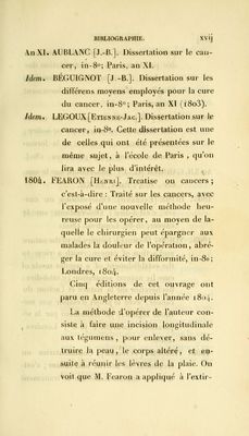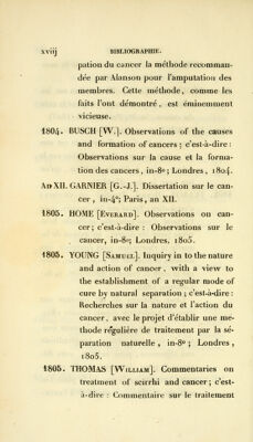 ![ihe relief of persons afflicted with can- cers ; c'est-à-dire : Plan adopté par les directeurs de l'hôpital de Midlesex, pour le soulagement des personnes affectées de cancer, in-8o ; Londres, 1793. 1793. ADAMS [Joseph]. Observations on the can- cerous breast; c'est-à-dire : Observations sur le cancer du sein, in-8° -, Londres, i793. 1793. JOENISCH [J.-H.]. Von den krebse und des- sein heilart ; c'est-à-dire : Du cancer et de son traitement, in-8° ; Saint-Pé- tersbourg, 1795. L'auteur accorde beaucoup trop de confiance à la céruse employée extérieu- rement. On sait du reste que ce même moyen avait été préconisé autrefois par Marchetti. 1793. PEARSON [John]. Practical observations on cancerous complaints, with and ac- count of some diseases, wich hâve been confunded with cancer; also critical remarks on some of the opérations per- formed in cancerous cases ; c'est-à-dire : Observations pratiques sur les maladies cancéreuses et exposé de certaines af-](https://iiif.wellcomecollection.org/image/b21040709_0019.jp2/full/800%2C/0/default.jpg)