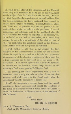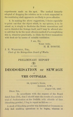 Preliminary reports... 1. On the deoderisation of sewage in the metropolitan sewers 2. on the deoderisation of sewage at the outfalls / by Henry E. Roscoe.