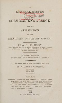 A general system of chemical knowledge; and its application to the phenomena of nature and art / By A.F. Fourcroy. Translated from the original French, by William Nicholson.