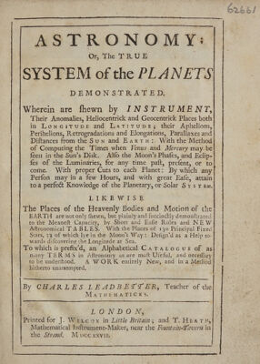 Astronomy; or, the true system of the planets demonstrated. Wherein are shewn by instrument, their anomalies, heliocentrick and geocentrick places both in longitude and latitude ... : likewise the places of the heavenly bodies and motion of the earth ... to which is prefix'd, An alphabetical catalogue of as many terms in astronomy as are most useful ... / by Charles Leadbetter.
