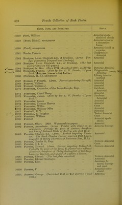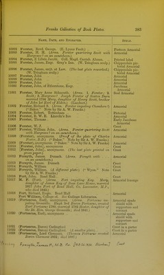 ![ffftUe^aiii,/\., M-ti;F. U.S. [M.iyu.nlil. F.R-S.mfJ Sl^e^iol^uU. 386 Fnmh Collection of Booh Plates. Name, Date, and Engbaver. 11076 11077 11078 11079 11080 11081 11082 11083 Foster, Miles Birket Foster, Nicholas, Episcopus Rapotensis. Premiums. Foster, Tho See School Foster, Thomas .. .. -A' jt Foster, Thomas. (The plate of Ingham Foster with altered inscription.) Foster, Thomas Campbell. {Arms. Foster impahng Crosse.) Foster, Thomas Willoughby Foster, Walter K. Foster, William .. 11084 Foster, William 11085 11086 11087 11088 11089 11090 11091 11092 11093 11094 Foster, William Orme Foster, William Sidney H Fothergill, Amae. Her Book. 1737.. .. .. •• M. A. F. {Note by Sir A. W. FranTiS, Mrs. Fothergill ) M. A. F. (Fothergill). [The last lAate printed in hhoe green.) . ■> ■ M. A. F. (Fothergill). {The last plate printed tn green) .. Fothergill, Sidney Roden. (Mussett, London.) (P. C. Baker. Note by Sir A. W. Franks.) (Fothergill), anonymous. {Note by Sir A. W. F^-anks, Miss By am sent me one luith in inJc Charles Fother- gill 1813.) Fothringham, The Eevd. Normand, d.d [Foulke, Le Doctem-.] {Printed in blue) Style. ^11095 /'11096 11097 11098 11099 11100 11101 11102 11103 11104 11105 Foulkes, John, M.D. Christ Chm-ch, Oxon. 1754. (Cole sc.) Foulkes, J., M.D. Ch. Ch. Oxou. (T. S. Cole Oxon scnlpsit.) Foulkes, John Jocelyn ■ •• , ■• Foulkes, Peter, D.D. Canon of Christ Chm-ch, Uxon. IH'I Foulkes, AVillm., a.m., of Christ Church, O.Kon. {Theplalc of Peler Foulkes with inscriplion altered.) 1754. Foulsham, E. Norwich Foulston, Eliza. {Arms. Foulston with Davies ■ on an escutcheon.) Fountaine, Andrew Fountains, Willm. Addison. {Arms. Fountaine quar- tering Addison.) (T. Topham sc.) Fourdrinier, John Coles XIV King's Light Dragoons. See Military Bookplates. IV Queen's Own Lt. Drags. See Military Bookplates. Fowke. {Note by Sir A. W. Franks, Lyons Booh ) Pictorial Jacobean Armorial Crest Chippendale Armorial Armorial Crest Armorial Armorial spade shield Interlaced initials in a decorative frame Armorial Armorial Printed label Urn crest and cypher Urn crest and cypher Urn crest and cj'pher Armorial Chippendale Armorial Crest Name in MS. in a Chippendale frame Chippendale Armorial Chippendale pic- torial Armorial Armorial Early Jacobeaii Armorial Eai-ly Jacobean Armorial Festoon printed label Armorial Armorial supporters Armorial Armorial Chippendale](https://iiif.wellcomecollection.org/image/b22650313_0001_0428.jp2/full/800%2C/0/default.jpg)