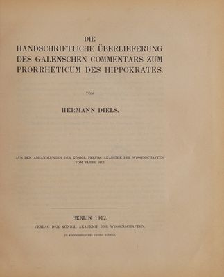 Die handschriftliche Überlieferung des Galenschen Commentars zum Prorrheticum des Hippokrates.