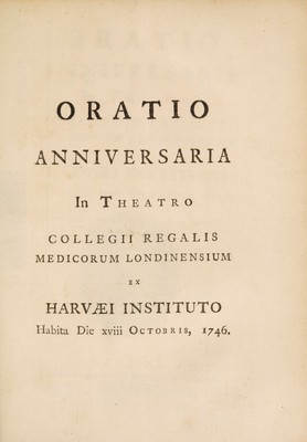 Credit: Oratio anniversaria : in theatro Collegii Medicorum Londinensium: Decimo quinto calend. Novembris ex Harveii instituto, ad socios habita anno MDCCXXXIX / a Fr. Nicholls. Source: Wellcome Collection.