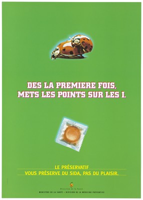 Credit: Two ladybirds copulating (above) and a condom (below), with the message that the condom preserves from AIDS and not from pleasure. Colour lithograph by Comed for the Ministère de la Santé, Division de la Médicine Préventive, Luxembourg. Source: Wellcome Collection.