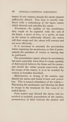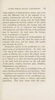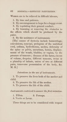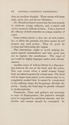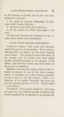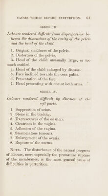 ![ORDER IIIf. Labours rendered difficult from disproportion be- tween the dimensions of the cavity of the pelvis and the head of the child. 1. Original smallness of the pelvis. 2. Distortion of the pelvis. 3. Head of the child unusually large, or too much ossified. 4, Head of the child enlarged by disease. 5. Face inclined towards the ossa pubis. 6. Presentation of the face. 7. Head presenting with one or both arms. ‘ ORDER IV. Labours rendered difficult by diseases of the soft parts. . Suppression of urine. . Stone in the bladder. . Excrescences of the os uteri. Cicatrices in the vagina. . Adhesion of the vagina. . Steatomatous tumours. . Enlargement of the ovaria. . Rupture of the uterus. we Oo kD amst & ou Note. The disturbance of the natura] progress of labours, more especially the premature rupture of the membranes, is the most general cause of difficulties in parturition.](https://iiif.wellcomecollection.org/image/b3328653x_0079.jp2/full/800%2C/0/default.jpg)