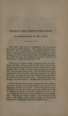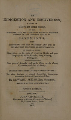 On indigestion and costiveness; a series of hints to both sexes, on the important, safe, and efficacious means of relieving diseases of the digestive organs by lavements ; with directions for the selection and use of apparatuses for their administration ; to which are added, observations on the mode of preserving health and prolonging life, by air, exercise, sleep, clothing, dieting, etc. Some general remarks, and useful hints, on the cause, prevention, and cure of obesity : also one hundred useful family prescriptions / [Edward Jukes].