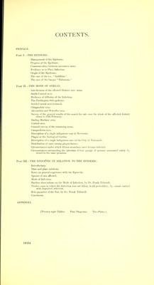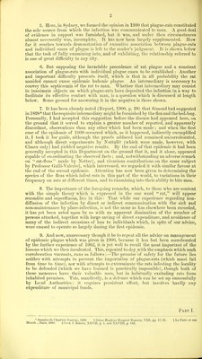![CONTENTS. PREFACE. Part I.-THE EPIDEMIC. Management of the Epidemic. Progress of the Epidemic. Communication between successive cases. Evidence as to Place Infection. Origin of the Epidemic. The case of the s.s. Antillian. The case of the barque Eulomene. Part II.—THE MODE OF SPREAD. Sub-division of the affected District into areas. South-Central area. Evidence of diffusion of the Infection. The Paddington Sub-epidemic. South-Central area resumed. Chippendale area. Alexandria and Waterloo area. Survey of the general results of the search for rats over the whole of the affected district down to nth February. Darling Harbour area. Central area. General survey of the remaining areas. Camperdown area. Description of a single indigenous case at Newtown. Plague at the Zoological Garden. Description of a single indigenous case at the City of Newcastle. Distribution of cases among plague-houses. Circumstances under which fifteen secondary cases liccame infected. Circumstances surroundmg the infection of four groups of persons associated solely by resort to the same premises. Part III.—THE EPIZOOTIC IN RELATION TO THE EPIDEMIC. Introductory. Time and place relations. Notes on general experience with the Epizootic. Species of rats affected. Mode of Infection. Further observations on the Mode of Infection, by Dr. Frank Tidswell. Twelve cases in which the Infection was not taken, in all probabilitj-, by casual contact with dej^osited infection. Ecto-parasites of the Rat, by Dr. Frank Tidswell. Conclusion. APPENDIX. [Twenty-eight Tables. Pour Diagrams. Two Plates.] 19354](https://iiif.wellcomecollection.org/image/b21354704_0117.jp2/full/800%2C/0/default.jpg)