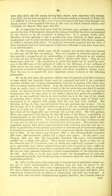 ![•were then shod, and, the season having heen winter, were otherwise fully clothed. Case K(d), having heen excepted in view of remarks made in a foot-note to Table III, it is difficult to see how the skin of the lower extremity could have heen brought into casual contact with deposited infection in the cases in which femoral buboes were exhibited {Of. Report, 1902, pars. 262-70.) 29. A suggestion has been made that the infection may, perhaps, be commonly received by way of the stomach, through the eating of food that has been contaminated by the excreta or by the secretions of plague-rats. It is perhaps worth while, therefore, to refer specially to the 9 jjersons who were infected at their places of employment, and to point out that workmen carry their dinner with them in parcels, in which it remains until eaten. It cannot be reasonably assumed that the food of these 9 j^atients had ever been exposed to infection, although it may have been eaten in an infected place. 30. The foregoing details (pars. 20-9) comprise not merely what was learned of each case, but all that was learned. They are complete in essential respects, and they provide a conspectus of the epidemiology of plague, although as the number of cases was but 3 2 no safe induction could be framed with them. They do not stand alone, however. The conclusions to which they point can be tested by refer- ence to the 303 cases of the outbreak of 1900, to the 139 cases of the outbreak of 1902, and to the two cases of 1903 ; and when this has been done, it is seen that the phenomena recorded in ] 904 agreed precisely with those recorded in former years. That this was so as regards the more important points is shown in the following paragraphs. 31. In the first place, the question whether these 12 patients owed their infection to cases which had preceded theirs must be examined, and with it the correlated question whether any of them communicated infection to jiersons with whom they were in contact during their illness. Now, the infection in Case A was not received from an earlier case—(«) because attack in the last preceding case dated 9 months earlier, {h) because absence of communication between A. and any other sick person during more than 10 days prior to his sudden attack was j)ositively established; and (c) he was positively known to have worked down to the time of his attack on premises where rodents were dying in unusual number, some of which were ascertained to be infected with plague after his case had been notified. The infection in Case A, then, was not derived from any previous case in man. Nor in the 10 cases, B to L, which next followed upon it, was the infection derived either from A or from any of them. Inter-communication was positively ascertained to have been all but impossible, and certainly did not take place. The 12th patient, M(d), was exposed to L(d) during the first 36 hours of his illness; a possibility of communication of the infection from L to M consequently existed, which will be examined immediately below. It is certain, therefore, that the cause of illness in the 11 cases A to L, did not consist in infection derived from man. The inference thus suggested, namely, that direct communication of the infection from the sick was no factor in production of this epidemic prevalence of bubonic and of septicaemic plague, is shown to be sound as soon as it is tested by comparison with the experience of 1900 and of 19U2. In the former year (Ptcport, 1900, p. 32), 276 households furnished 289 cases; 266 households yielded but a single case apiece. In the latter year (Report, 1902, par. 195), 124 households furnished 139 cases; 115 households yielded but a single case apiece. These broad statements, based as they are on the observed facts of 2 outbreaks, each of which was sufiiciently extensive to avoid error, and which were widely separated from each other in point of time, suffice by themselves to establish the proposition mentioned above, namely, that these outbreaks did not owe their epidemic character to direct communication of the infection from the sick. And Avhen, as in the year under review, the circumstances of each case are examined minutely, that broad inference is found to stand the test of individual application perfectly. 32. After having shown that epidemics of bubonic and of septicsemic plague are not due to direct communication of infection from the sick, an answer to the subsidiary question, how often such communication does occur, may be sought. The three couplets constituted by cases B and E(d), D and P, L(d) and M(d), were respectively connected with two places of employment and with one residence. A prima facie case for direct communication appears therefore, but it breaks down as soon](https://iiif.wellcomecollection.org/image/b21354704_0246.jp2/full/800%2C/0/default.jpg)