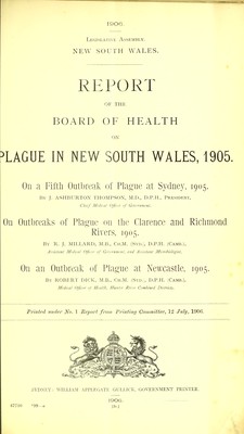 Report on the outbreak of plague at Sydney [1900-1907] / by J. Ashburton Thompson, Chief Medical Officer of the Government and President of the Board of Health.
