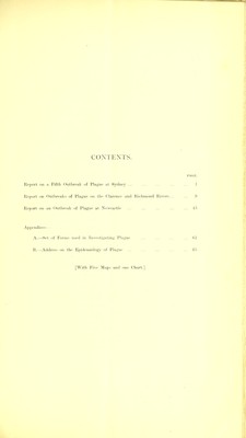 ![1 I i • i i! CONTENTS. i PAGE. Rf'port oil a Fifth ()utl>roak of Plasjue at Sj'dnpy ... ... ... ... ... 1 lleport Dii (^utl:)re'aks of Plajj;ue on the Claroiicc and llicliinond Rivers... ... 9 Report on ;i.n Outbreak of Phigue at Newcastle ... ... ... ... ... 4.3 Appendices— A. —Set iif Forms use<l in I n\rstiuatinn' PlaLCUc ... ... ... ... 61 B. —-Address on the Epidemiology of Plague ... ... ... ... ... 6.'i [Witli Five Maps and one Chart.]](https://iiif.wellcomecollection.org/image/b21354704_0263.jp2/full/800%2C/0/default.jpg)