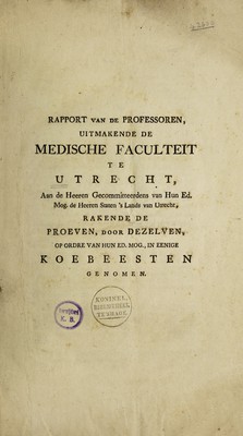 Rapport van de Professoren, uitmakende de Medische Faculteit te Utrecht, aan de Heeren Gecommitteerdens van ... de Heeren Staten's Lands van Utrecht, rakende de proeven door dezelven ... in eenige koebeesten genomen.
