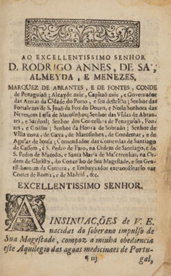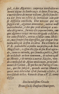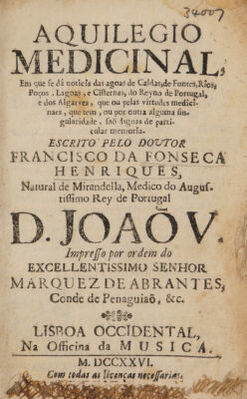 Aquilegio medicinal, em que se dá noticia das agoas de caldas, etc. do Reyno de Portugal ... que ou pelas virtudes medicinaes, que tem, ou por outra alguma singularidade, saõ dignas de particular memoria / [Francisco da Fonseca Henriques].